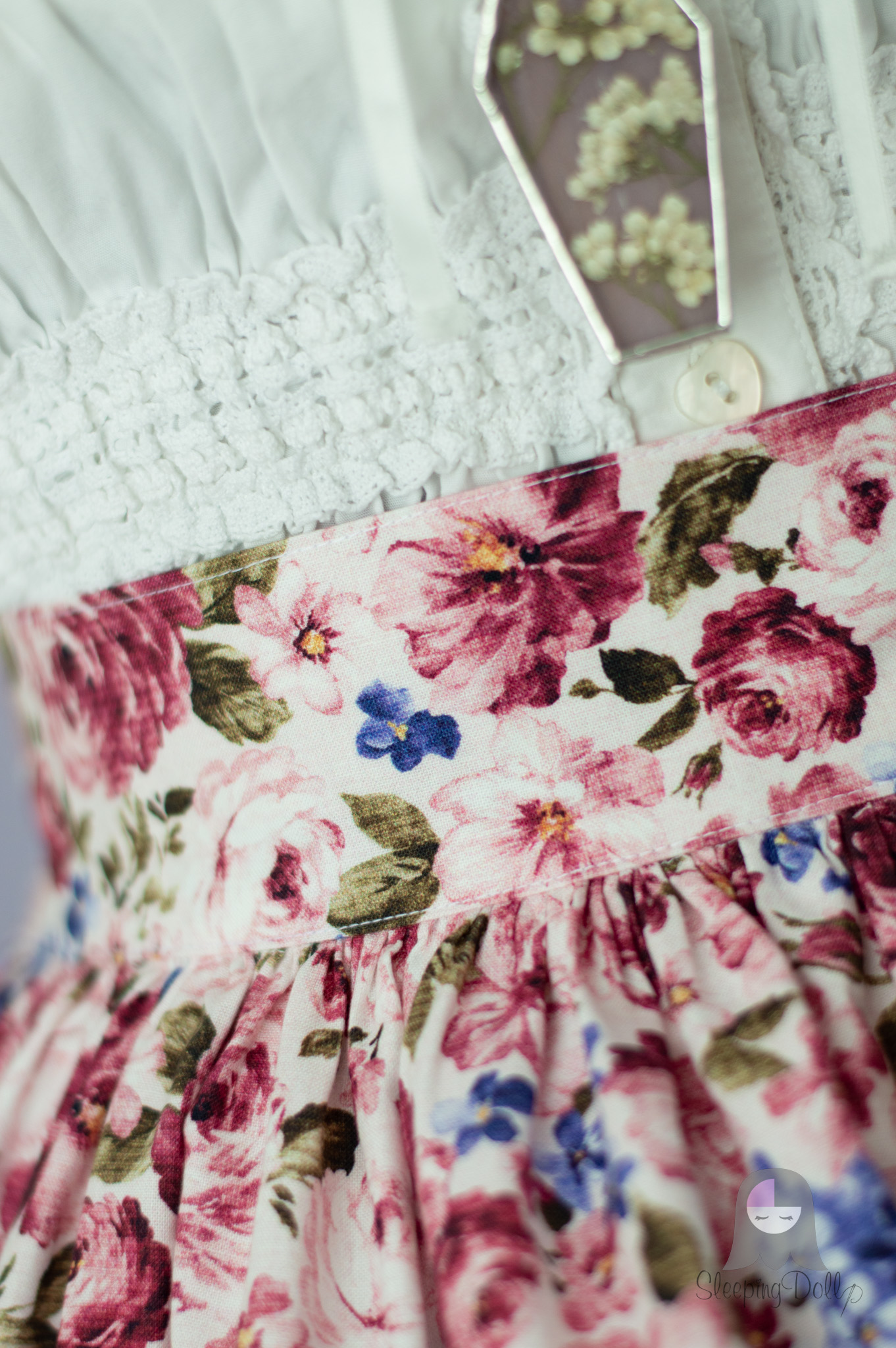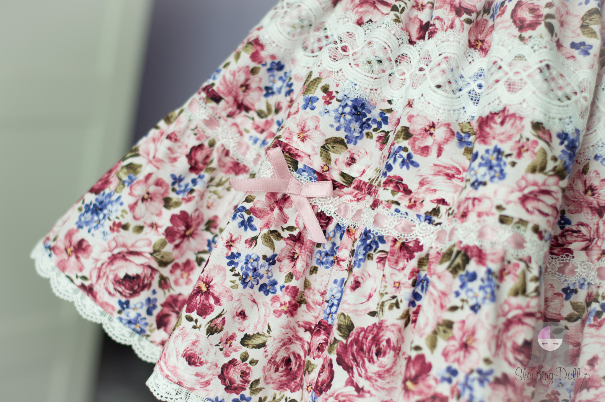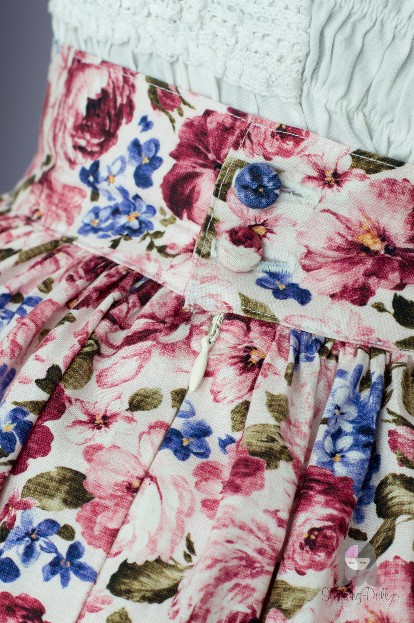 This beautiful skirt is sewn from soft, high-quality cotton, decorated with delicate white lace with roses and satin ribbon. The half-elastic waistband ensures a comfortable fit reinforced with fusible lining to keep its shape. A hidden side zipper and two matching buttons add a seamless touch of elegance.